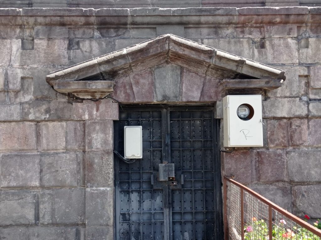 Este detalle arquitectónico es un frontón triangular de piedra ubicado sobre una puerta metálica negra. Este frontón está sostenido por dos ménsulas pequeñas a cada lado, lo que le da un aire clásico y robusto.